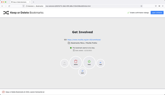 เก็บหรือ ลบ บุ๊กมาร์ก เป็นส่วนเสริมของ Firefox ที่ออกแบบมาเพื่อทำให้การจัดการบุ๊กมาร์กมีประสิทธิภาพมากขึ้น เครื่องมือนี้ที่ใช้การสมัครสมาชิกจะแสดงบุ๊กมาร์กแบบสุ่ม ทำให้ผู้ใช้สามารถเก็บ ลบ ข้าม หรือเปิดในแท็บใหม่เพื่อการตรวจสอบ ฟีเจอร์หลักประกอบด้วยรายการที่อนุญาตสำหรับบุ๊กมาร์กที่เก็บไว้ การตรวจสอบอัตโนมัติสำหรับลิงก์ที่เสีย และรายการข้ามภายในสำหรับโดเมนที่ไม่สามารถตรวจสอบได้ ผู้ใช้สามารถนำทางบุ๊กมาร์กได้อย่างรวดเร็วโดยใช้ทางลัดแป้นพิมพ์และจัดการการตั้งค่าของตนได้อย่างง่ายดาย รวมถึงการปิดการแจ้งเตือนยืนยันสำหรับการลบ